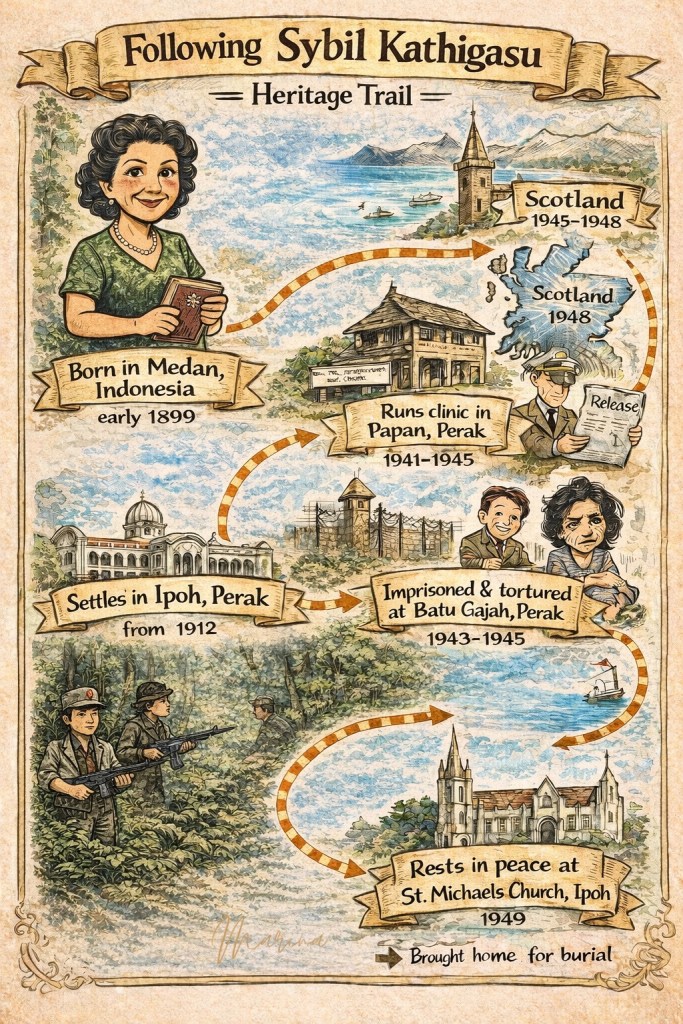 While she was born in Medan, Indonesia, the story of this daughter of Malaysia unfolds in cities and towns in Perak like Papan (where she and her husband Dr Abdon Clement ran a clinic), Batu Gajah (where she was incarcerated) and the her final resting place, which is the cemetery in the grounds of St Michael’s Church in Ipoh.