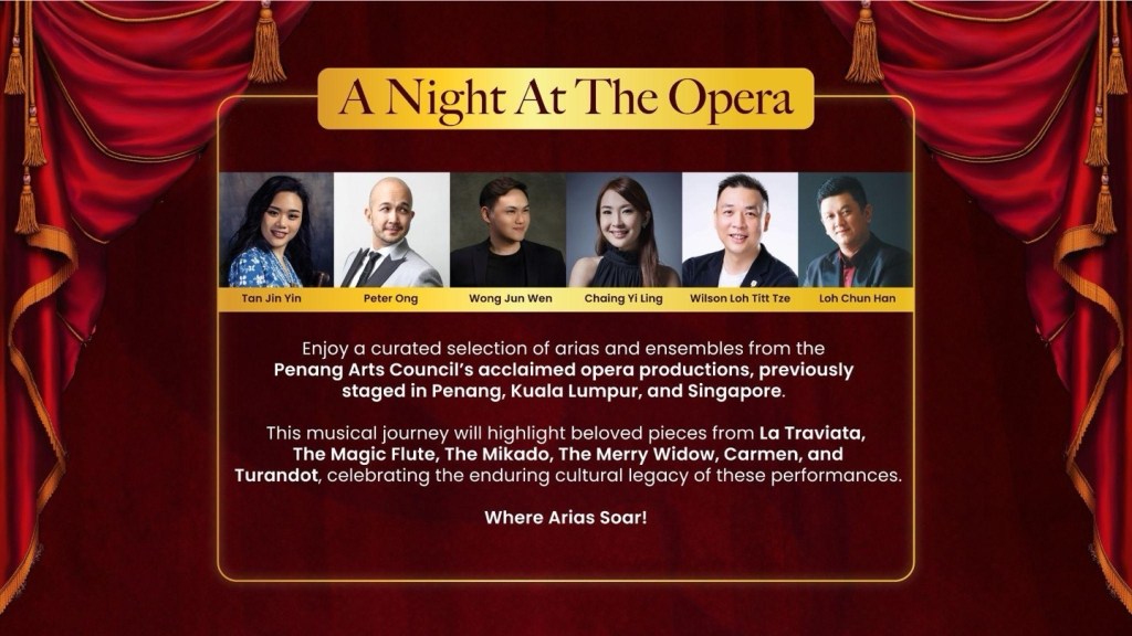 Handpicked from decades of celebrated performances across Penang, Kuala Lumpur, and Singapore, the repertoire will include beloved arias and ensembles from La Traviata, The Magic Flute, The Mikado, The Merry Widow, Carmen and Turandot.